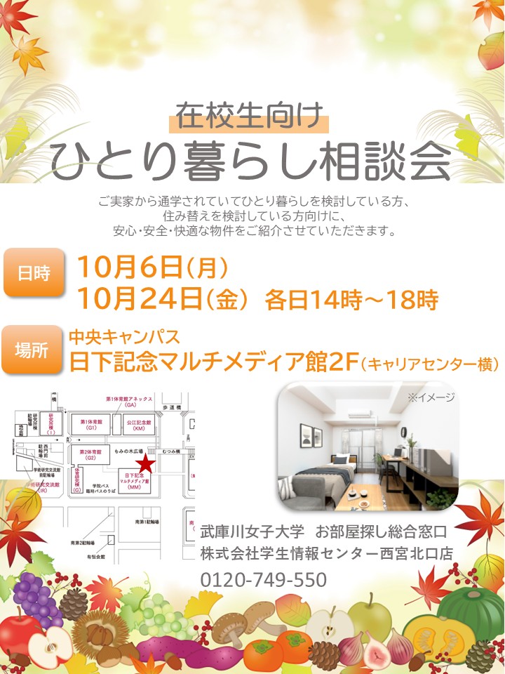 在校生向けひとり暮らし相談会について、ご案内いたします。この秋からのお引っ越しはもちろん、来春からご入居できるお部屋もご紹介可能でございます。