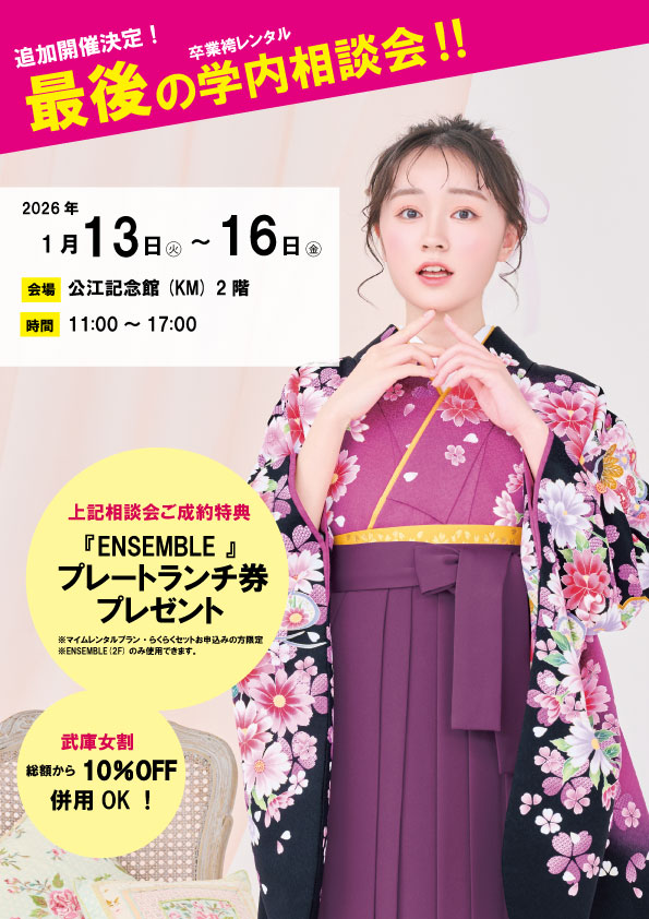 年末にご案内いたしました卒業袴レンタルの学内相談会について、再度ご案内いたします。今回が本当に最後の学内相談会となります!お友達と是非ご来場ください!